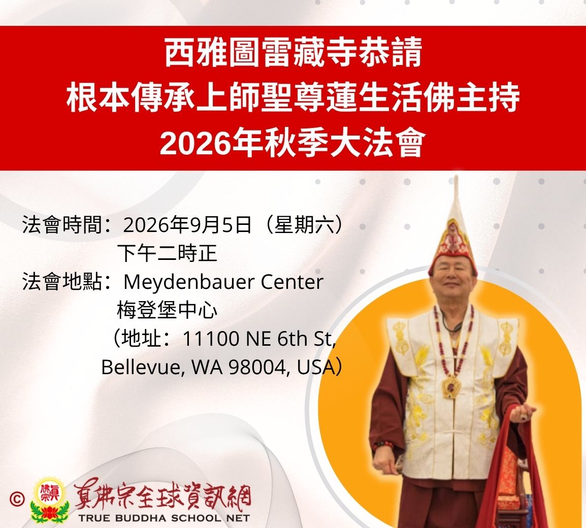 西雅圖雷藏寺恭請根本傳承上師聖尊蓮生活佛主持2026年秋季大法會。
