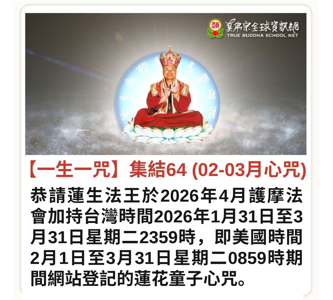 宗委會將於2026年4月收集接下來的蓮花童子心咒,在4月護摩法會呈交師尊加持。(台灣時間2026年2月1日至3月31日星期二2359時,即美國時間2月1日至3月31日星期二0859時期間登記的心咒)
