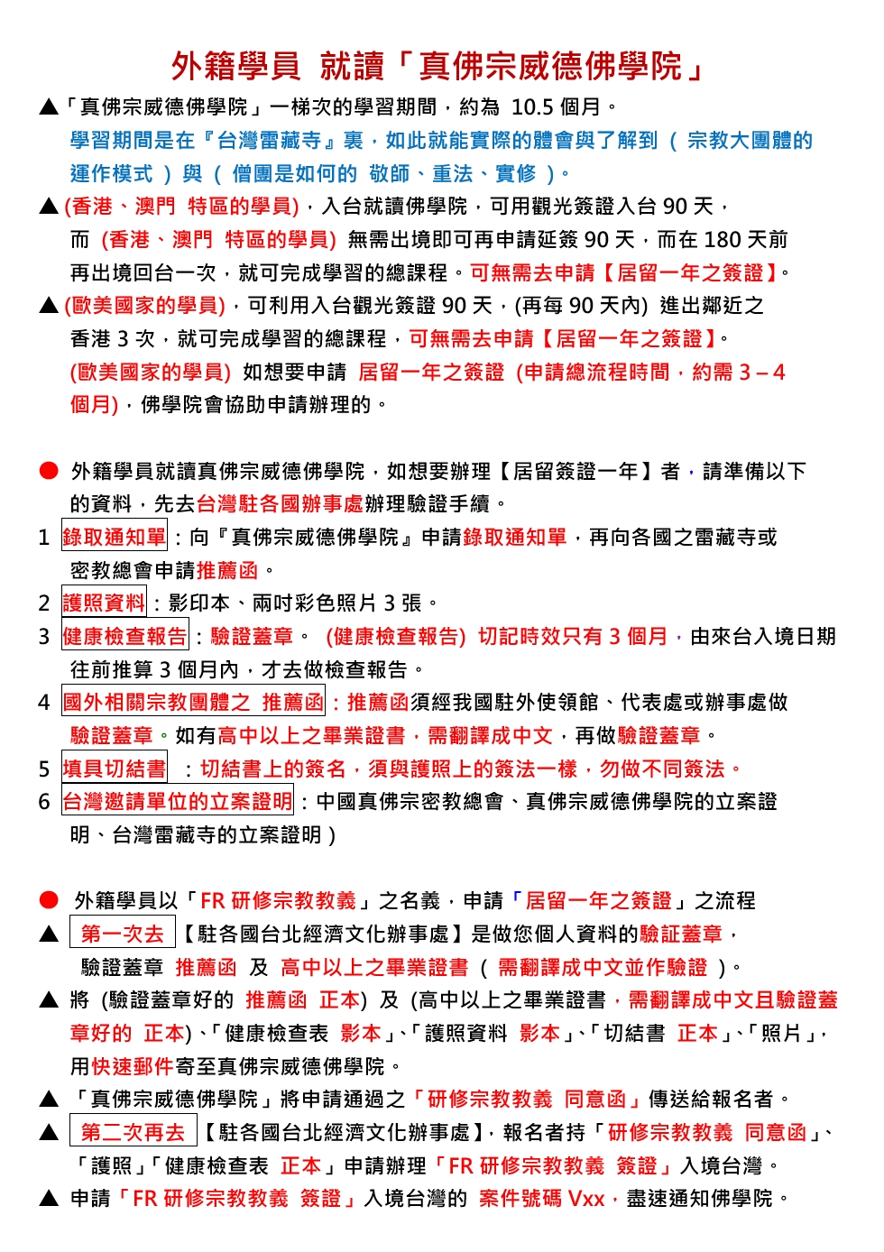 ▲ 申請「FR研修宗教教義 簽證」入境台灣的 案件號碼Vxx,盡速通知佛學院。