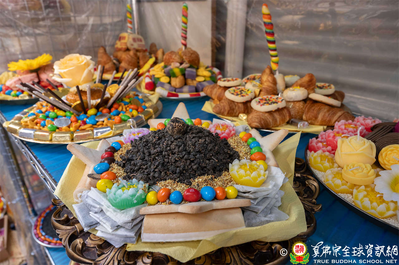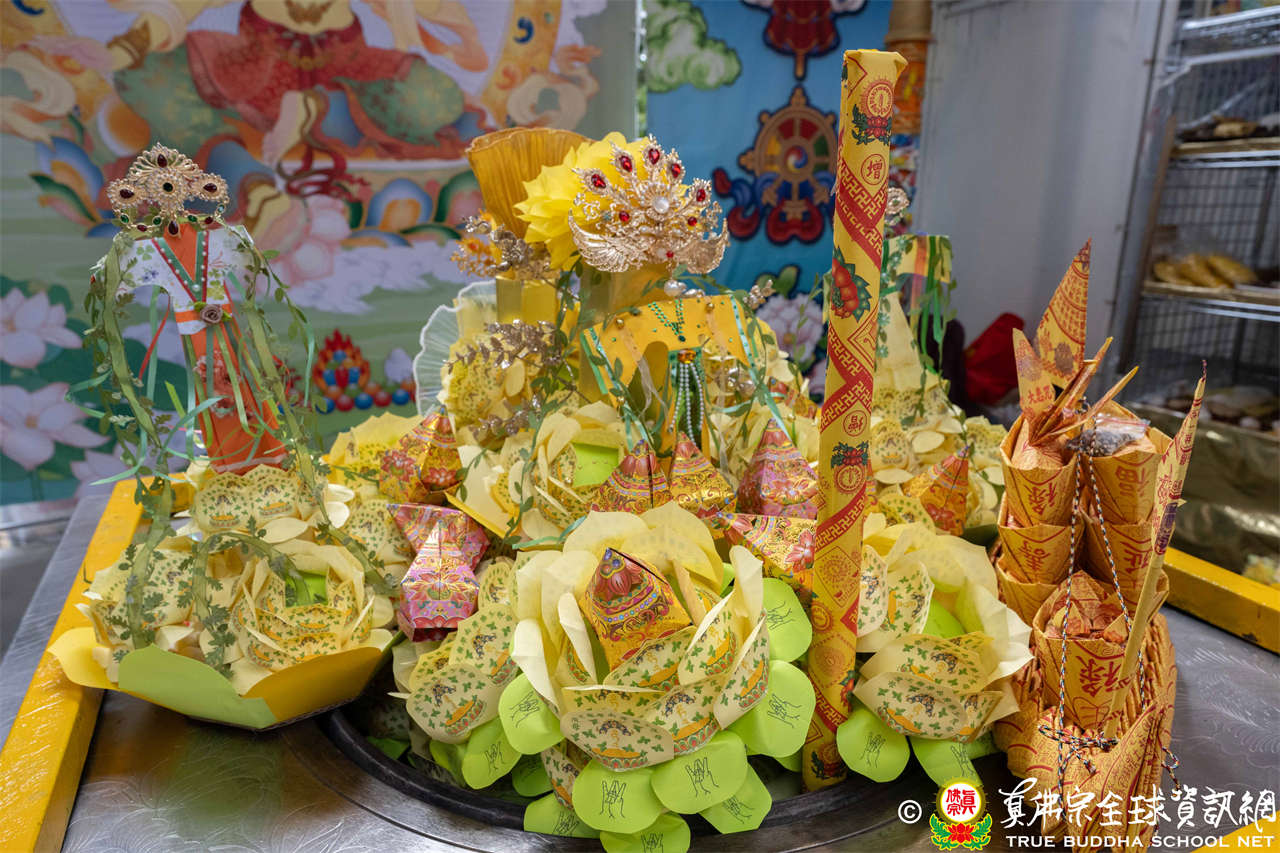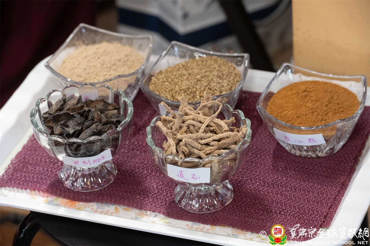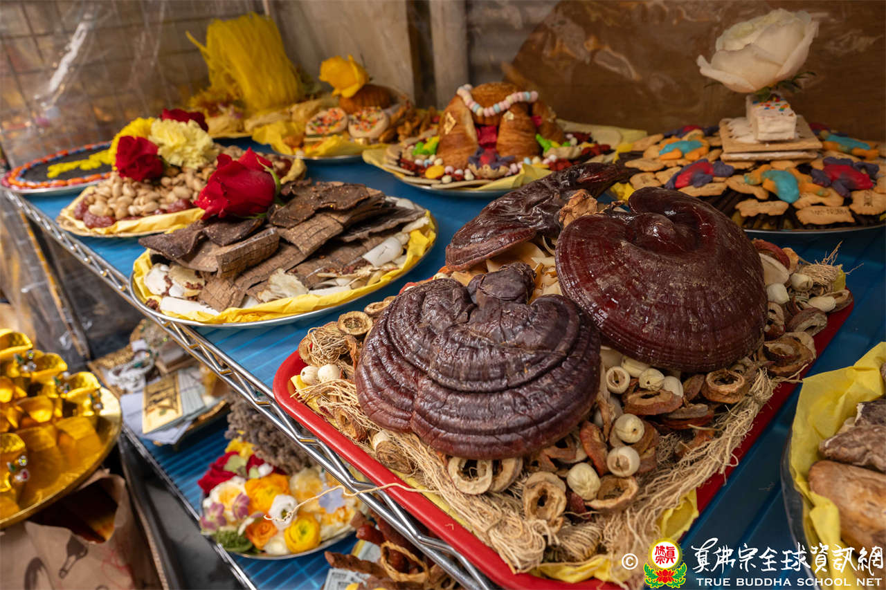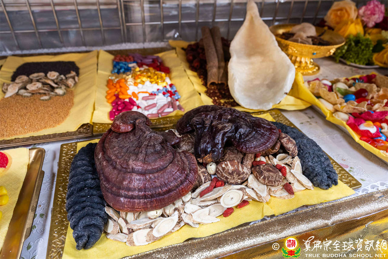 供品五味藥:蛇床子、制附子、遠志、甘草、桂心等中藥粉,象徵祂布施甘露,解除病苦。法王指出:「制附子最貴,甘草最便宜。」