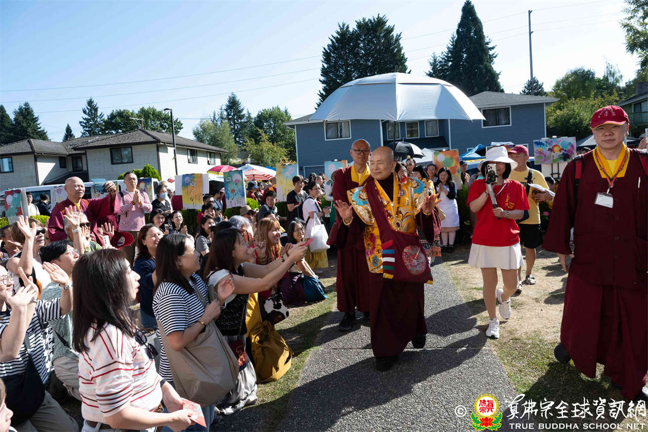 下午一時十五分,聖尊抵達會場,在擁擠的人潮中,一一加持各攤位及報名處。弟子們恭敬讓道,滿懷欣喜與孺慕之情。