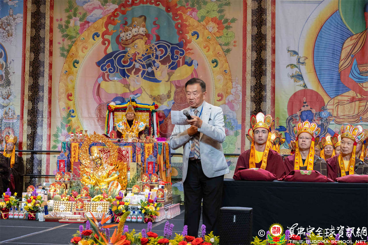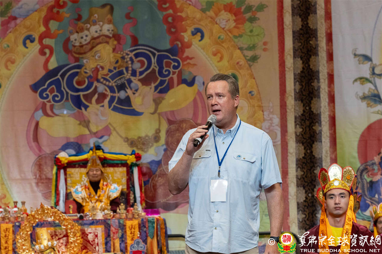 Bellevue市議員Jared Nieuwenhuis致詞時表示,蓮生活佛創立西雅圖雷藏寺所舉行的秋季大法會,是一個開啟新世界、弘揚佛法的時刻,雷藏寺散發著密教的智慧與慈悲的光芒,願我們共同祈禱,為世界帶來光明與和諧。