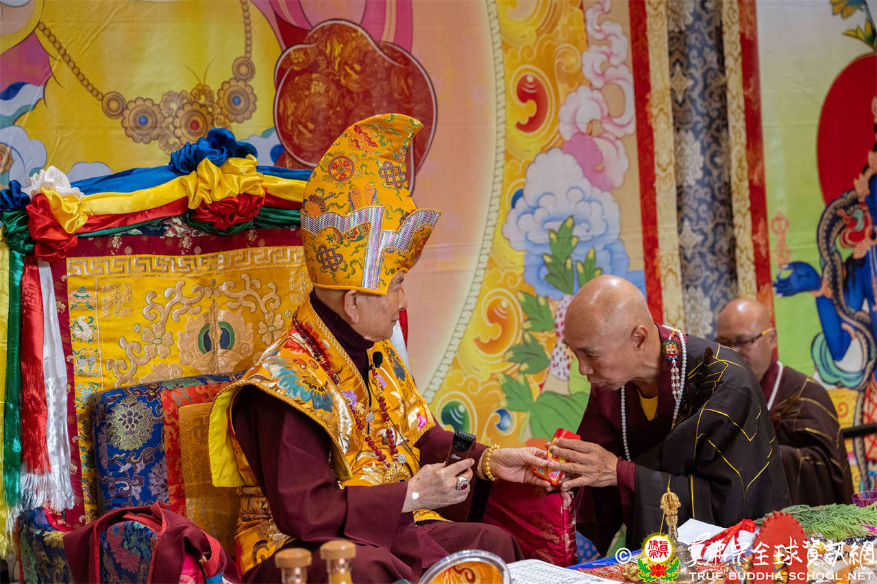 西雅圖雷藏寺住持釋蓮吟上師代表四眾向聖尊敬獻哈達,同時,與會眾等齊舉手中哈達以觀想敬獻於聖尊,秋季大法會開始進入阿彌陀佛密法的修持儀軌。