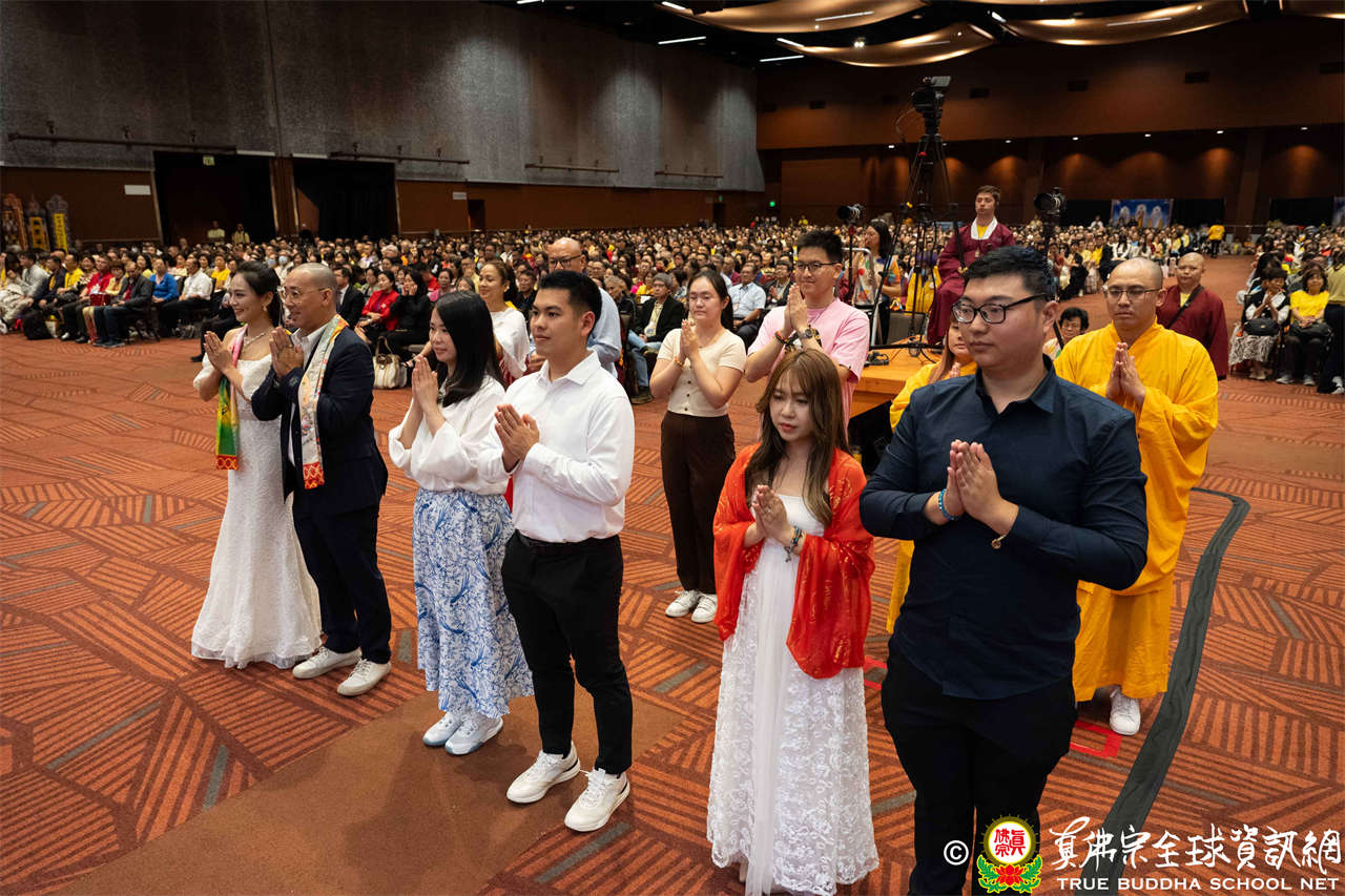 接著,聖尊為六對新人做福證,祝福新人們婚姻美滿、共組佛化家庭。