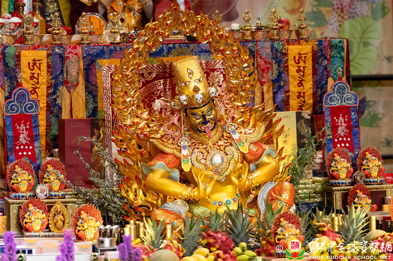 下午二時整,磬聲悠揚響起,四眾弟子虔誠合掌唱誦蓮花童子心咒,恭迎根本傳承上師聖尊蓮生活佛入壇場,眾等跟隨聖尊向佛菩薩與護法諸尊做大禮拜,法會正式揭開序幕。