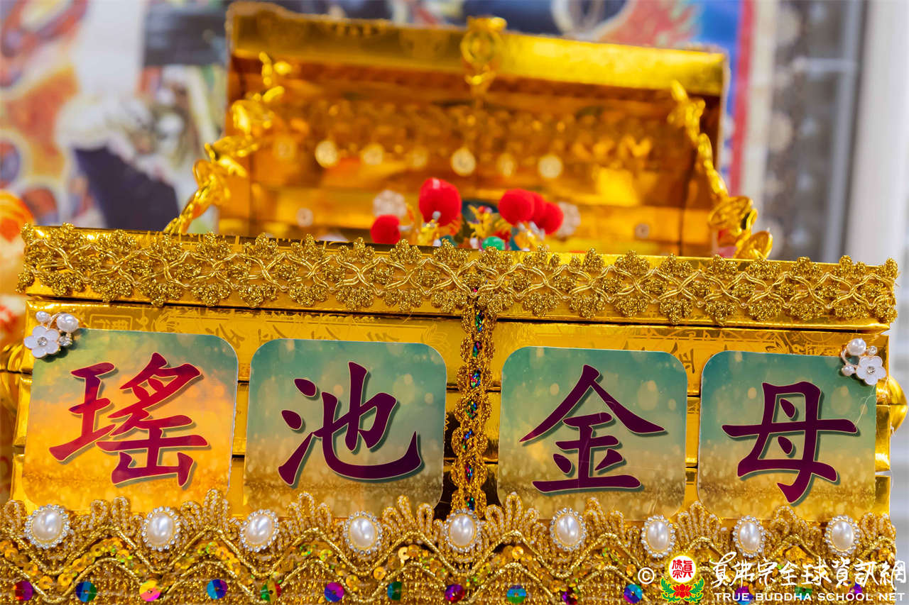 法王分享,香港十方同修會曾特別恭製一尊「萬佛手無極瑤池金母大天尊」,現供奉於南山雅舍。聖像高大宏偉,端坐之姿已超過真人高度,背光莊嚴,萬手遍布,雙目靈動如生,令人見之心生敬畏。若心中有愧,站在祂面前甚至不敢直視,因為祂彷彿看穿一切。法王讚嘆此尊金母莊嚴非凡,將來南山雅舍將獻出,讓所有人皆能親眼頂禮。