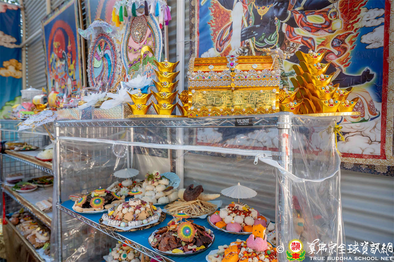 接著法王介紹此次法會主尊大白傘蓋佛母,其功德是:「得日月星斗擁戴、得吉祥賜福、可息、增、懷、誅、能鎮護國家,退怯强敵、遮止地水火風災難,威力無窮。其形象有獨尊的,也有千手千眼大白傘蓋佛母」。