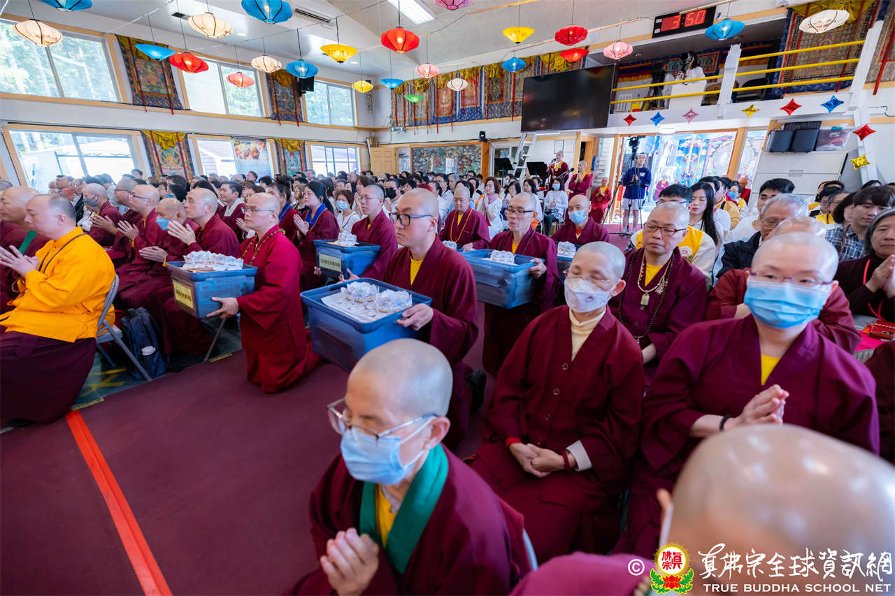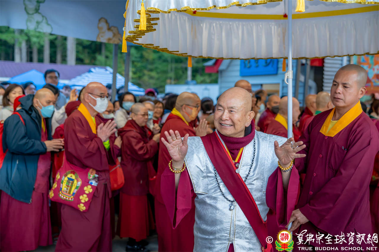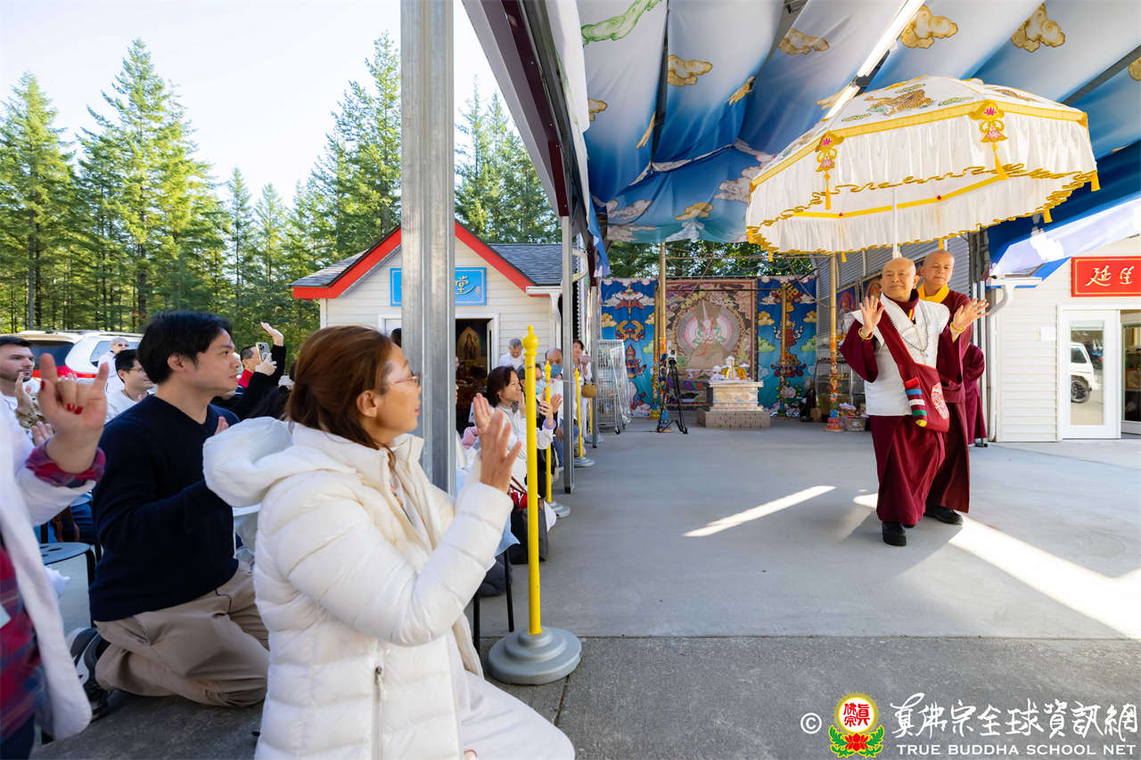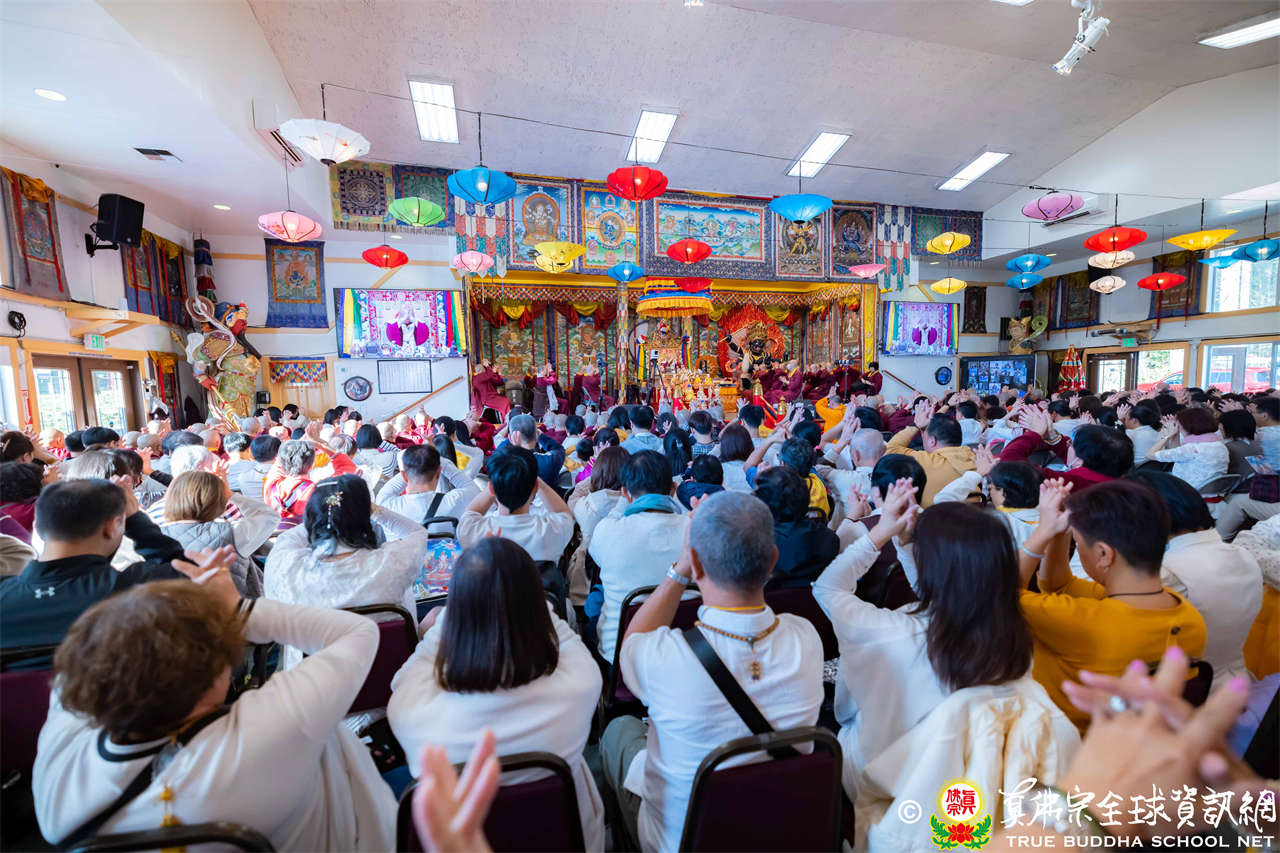 法王開示畢,衆人報以熱烈掌聲感謝法王。接著法王下座與線上弟子互相問候,並為與會大衆賜授大白傘蓋佛母法灌頂。法會至此圓滿結束。