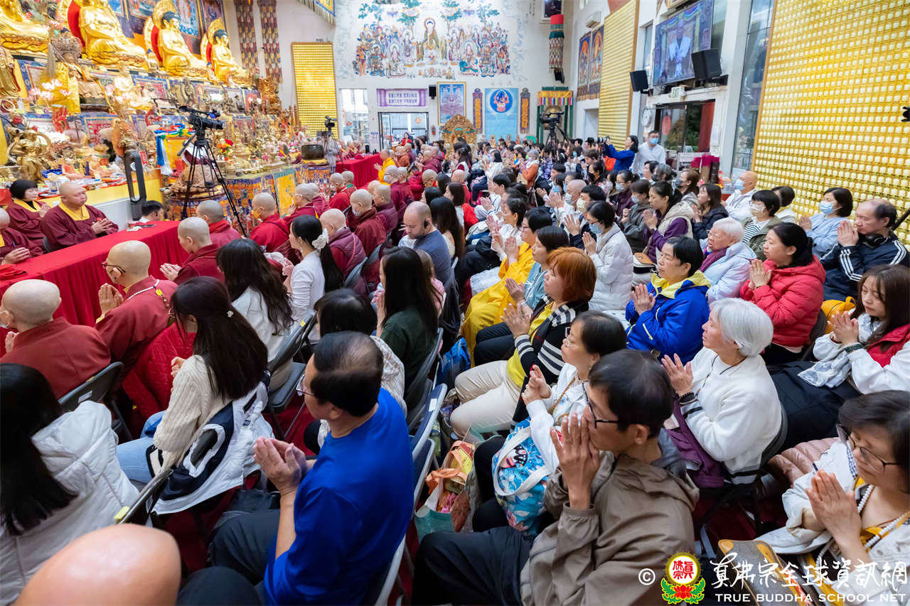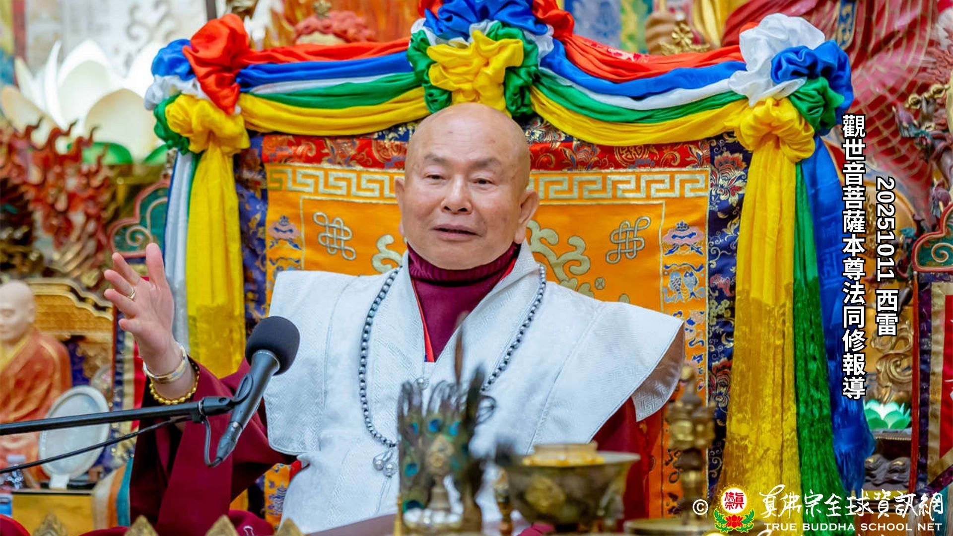 2025年10月11日晚上八時,美國西雅圖雷藏寺舉行觀世音菩薩本尊法同修,四眾弟子齊聚大雄寶殿,恭迎根本上師蓮生活佛盧勝彥前來主持修法。現場透過Zoom、Youtube進行網路直播,世界各地善信一齊參與,同霑法益,共沐佛光。