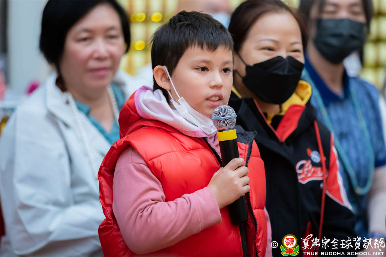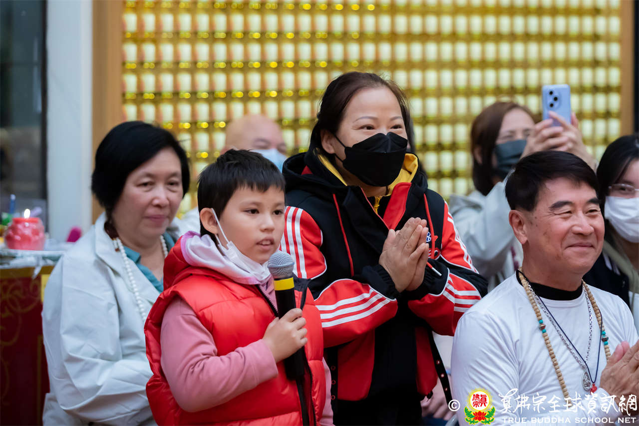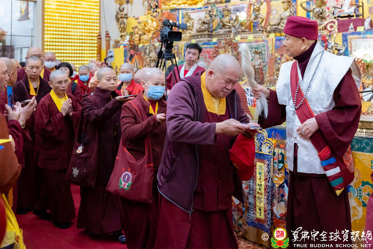 精彩的寶貴開示後,聖尊慈悲加持大悲咒水、開光佛像,並為新皈依弟子做皈依灌頂,然後手持拂塵,一一加持與會大眾。