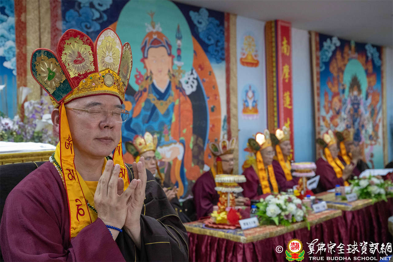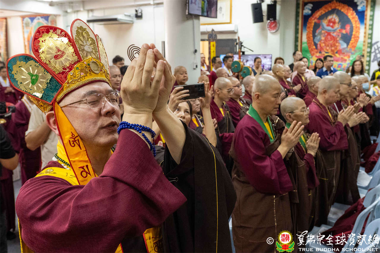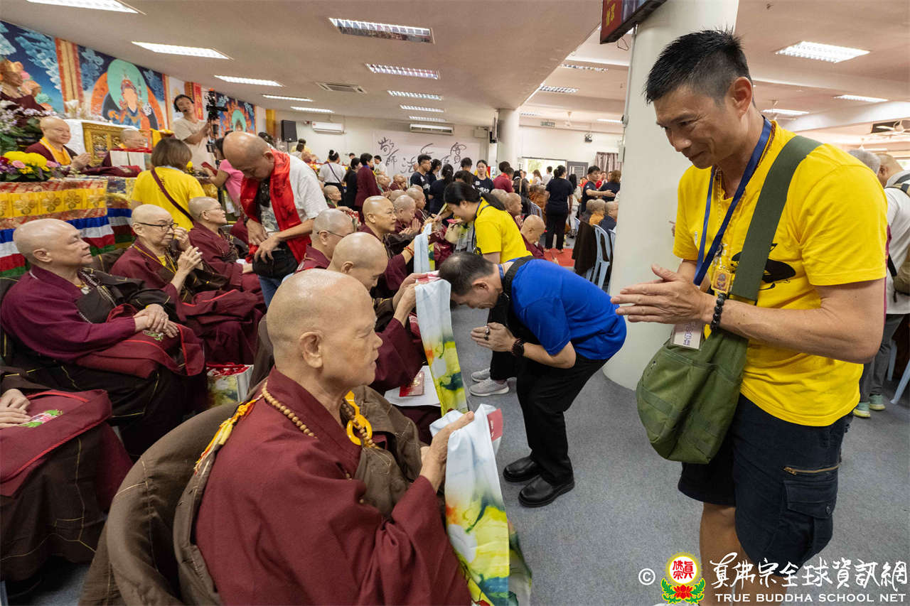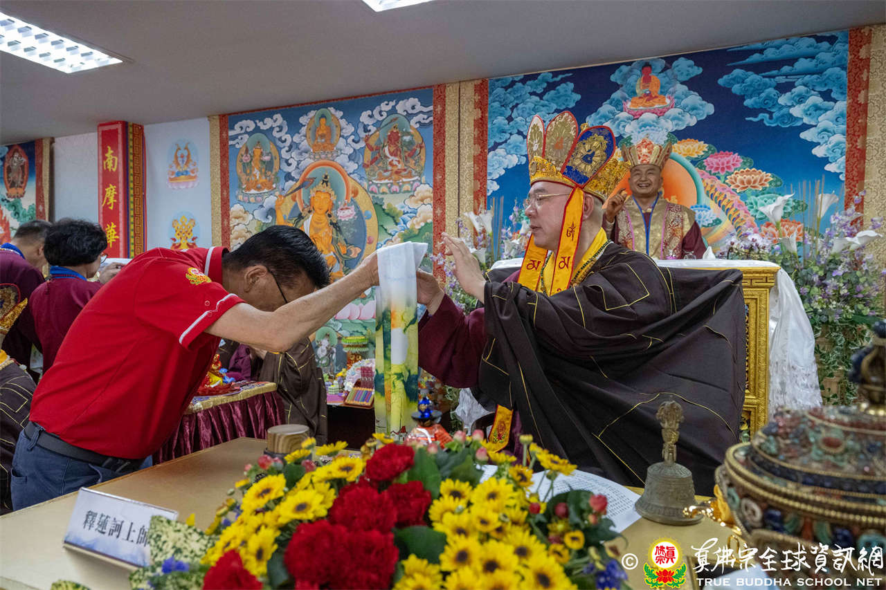 供僧大會依循《真佛宗供僧儀軌》肅穆進行,由長老釋蓮栽上師代表根本上師聖尊蓮生活佛盧勝彥納受信眾供養,並代表供養住世羅漢賓頭盧尊者。全體真佛弟子齊聲念誦《請佛住世祈願文》,祈請根本上師常住世間、永轉法輪;現場亦有南傳僧人持誦巴利文《祈禱文》,北傳僧人念誦《大悲咒》及《心經》。隨後,眾同門善信向僧眾敬獻哈達與供養,並由釋蓮栽長老開示佛法,供僧大會圓滿。