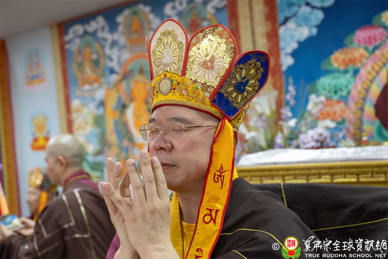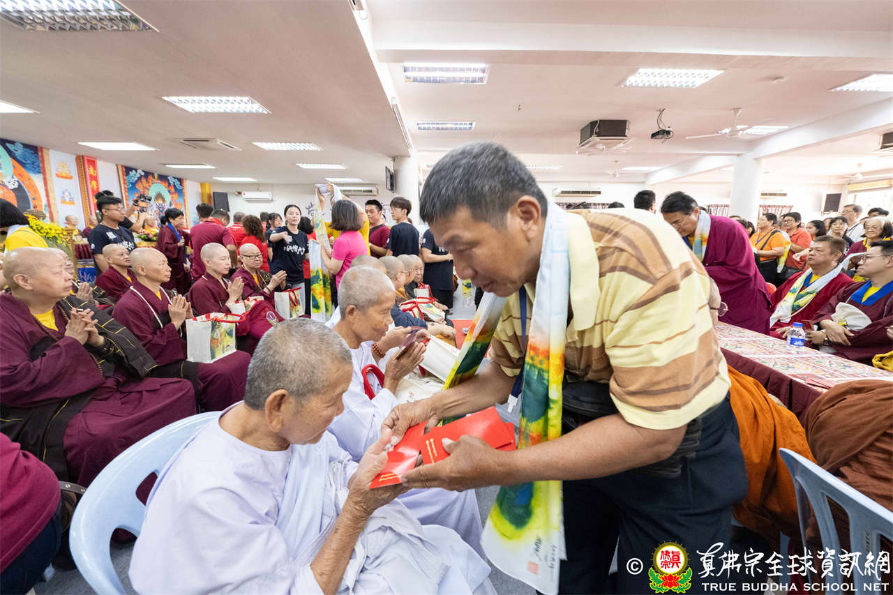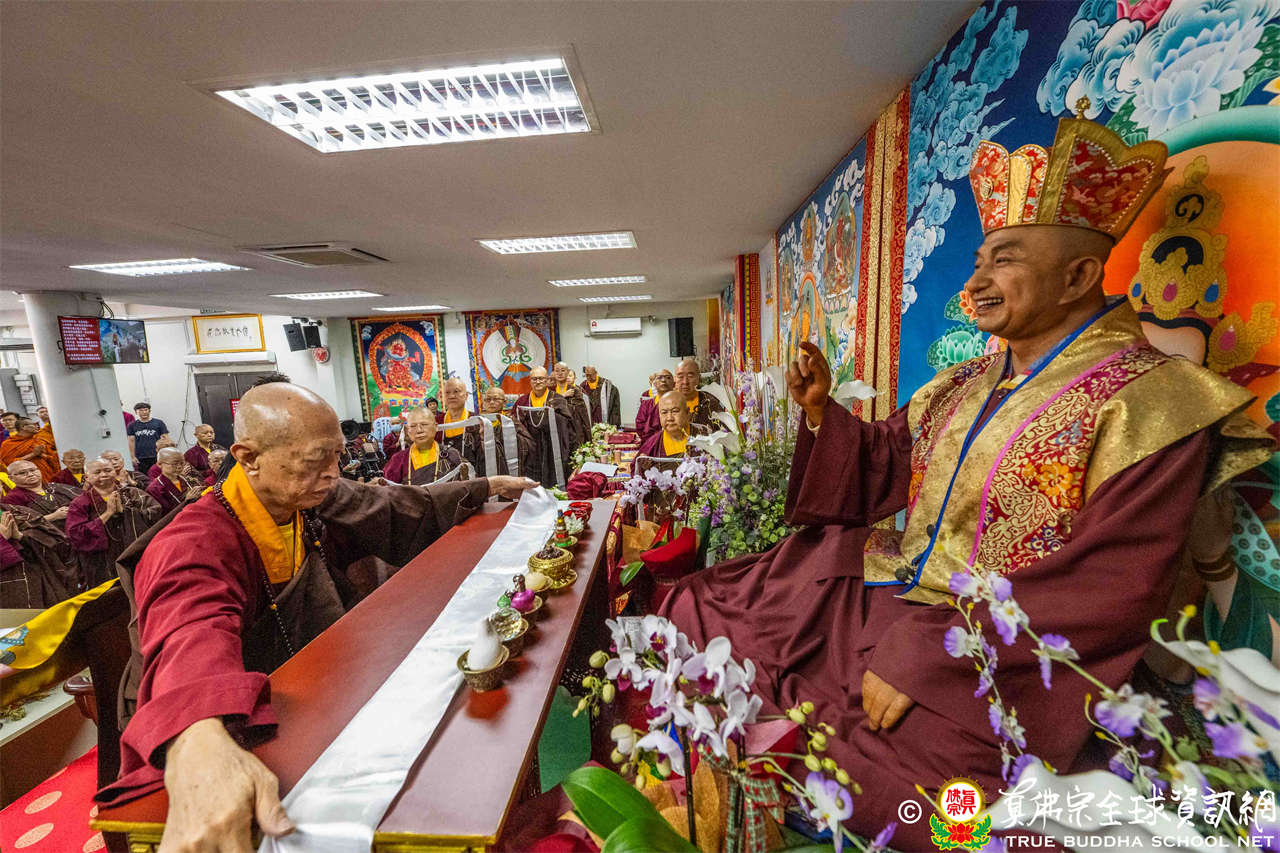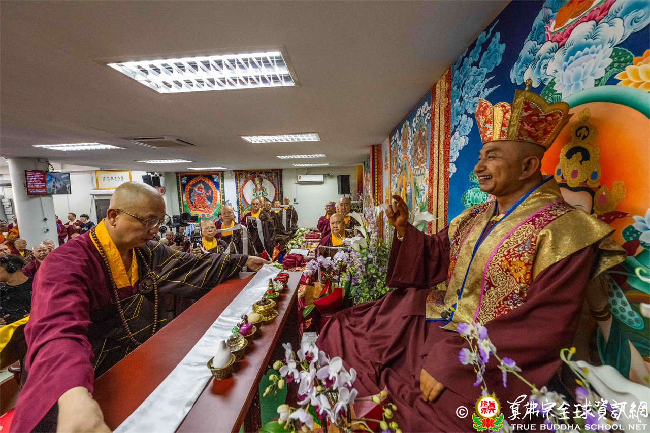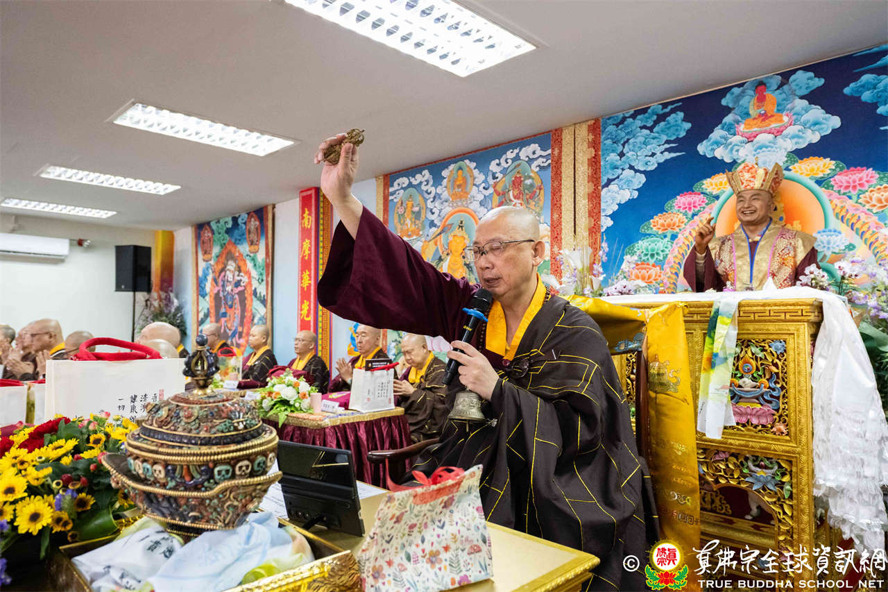 供僧大會依循《真佛宗供僧儀軌》肅穆進行,由長老釋蓮栽上師代表根本上師聖尊蓮生活佛盧勝彥納受信眾供養,並代表供養住世羅漢賓頭盧尊者。全體真佛弟子齊聲念誦《請佛住世祈願文》,祈請根本上師常住世間、永轉法輪;現場亦有南傳僧人持誦巴利文《祈禱文》,北傳僧人念誦《大悲咒》及《心經》。隨後,眾同門善信向僧眾敬獻哈達與供養,並由釋蓮栽長老開示佛法,供僧大會圓滿。