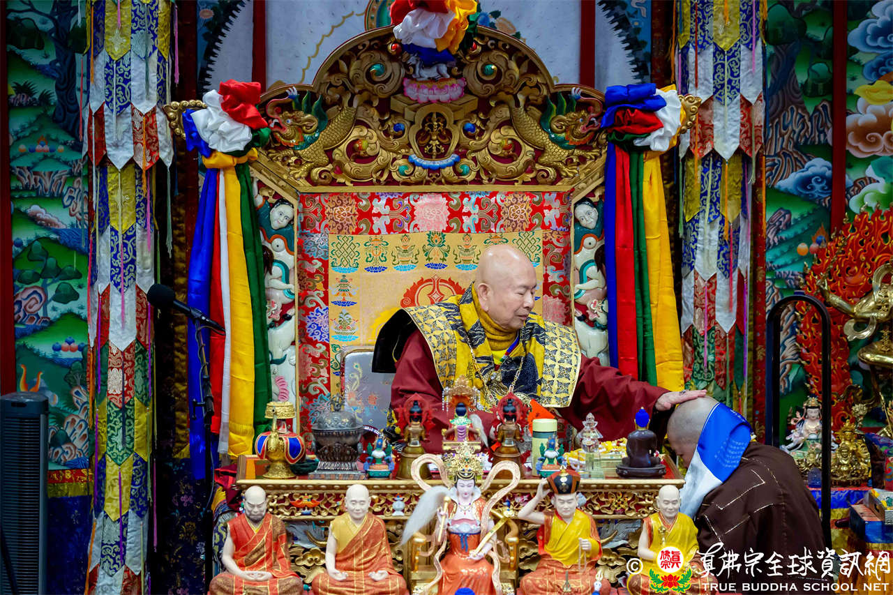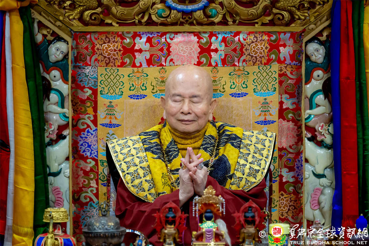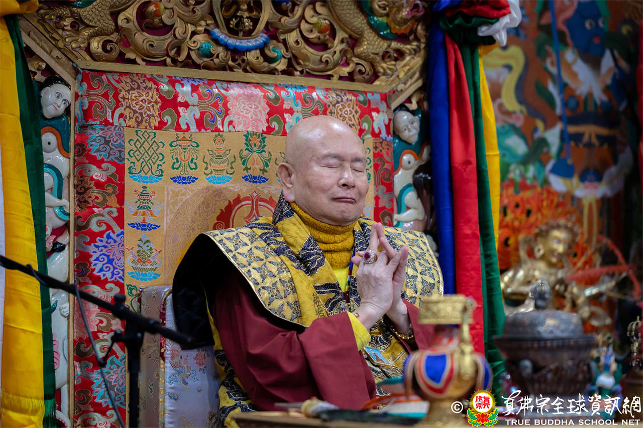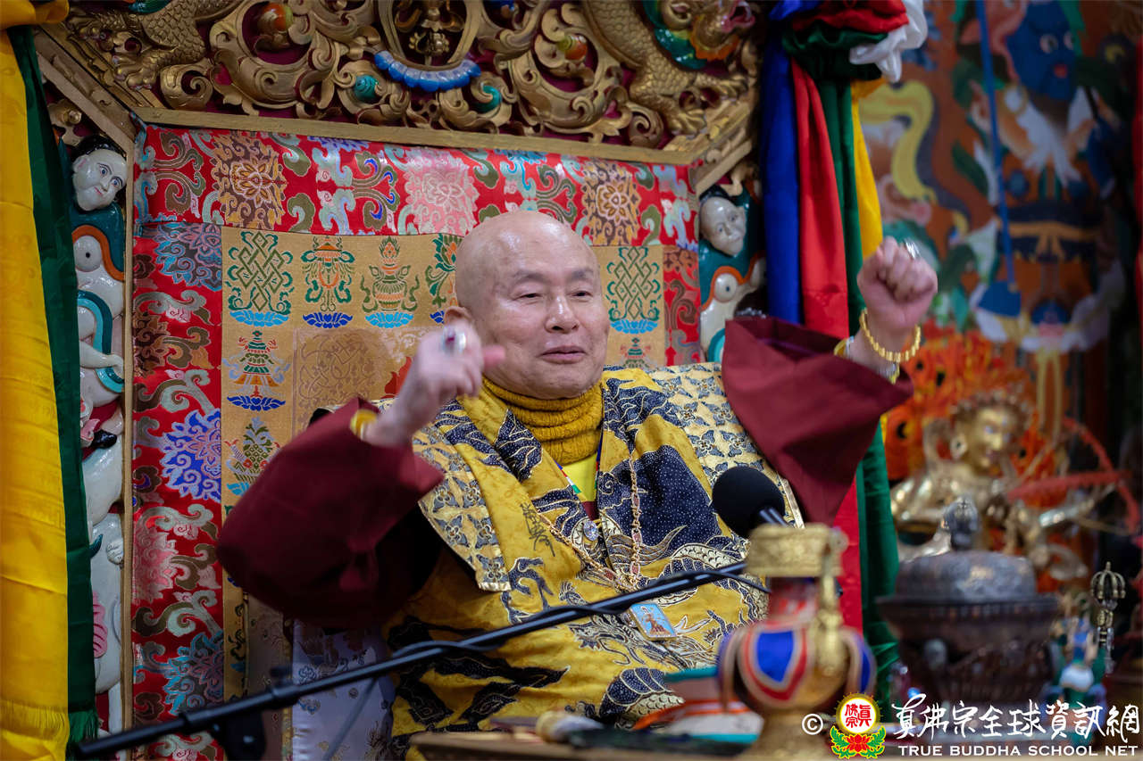 接著,法王繼續講解《大佛頂首楞嚴經》〈卷第四〉:「無上大悲清淨寶王,善開我心。能以如是種種因緣,方便提獎,引諸沈冥出於苦海。世尊。我今雖承如是法音,知如來藏妙覺明心遍十方界,含育如來十方國土,清淨寶嚴妙覺王剎。如來復責多聞無功,不逮修習。我今猶如旅泊之人,忽蒙天王賜與華屋,雖獲大宅,要因門入。惟願如來不捨大悲,示我在會諸蒙暗者,捐捨小乘,畢獲如來無餘涅槃本發心路。令有學者,從何攝伏疇昔攀緣,得陀羅尼,入佛知見。作是語已,五體投地。在會一心,佇佛慈旨。」